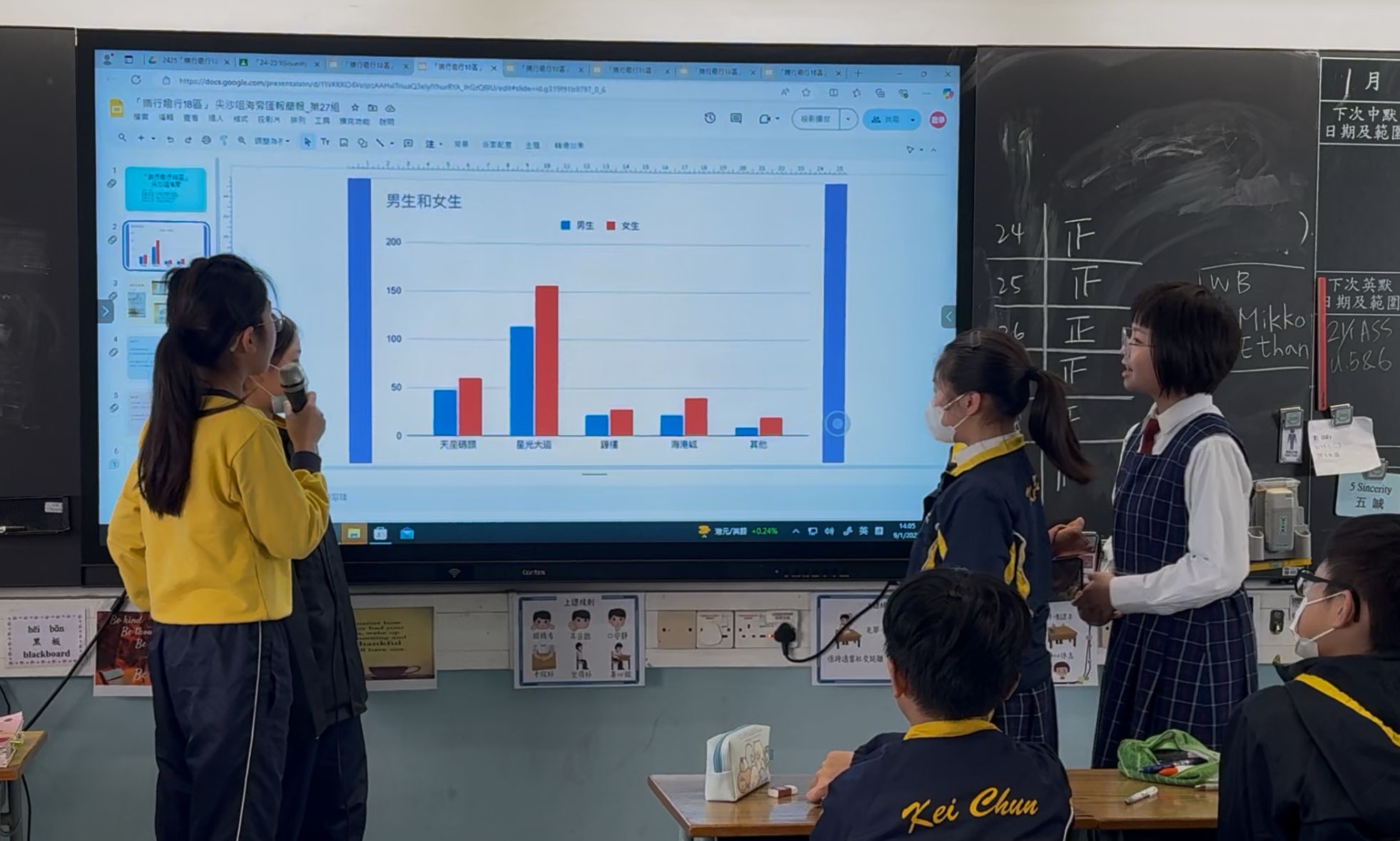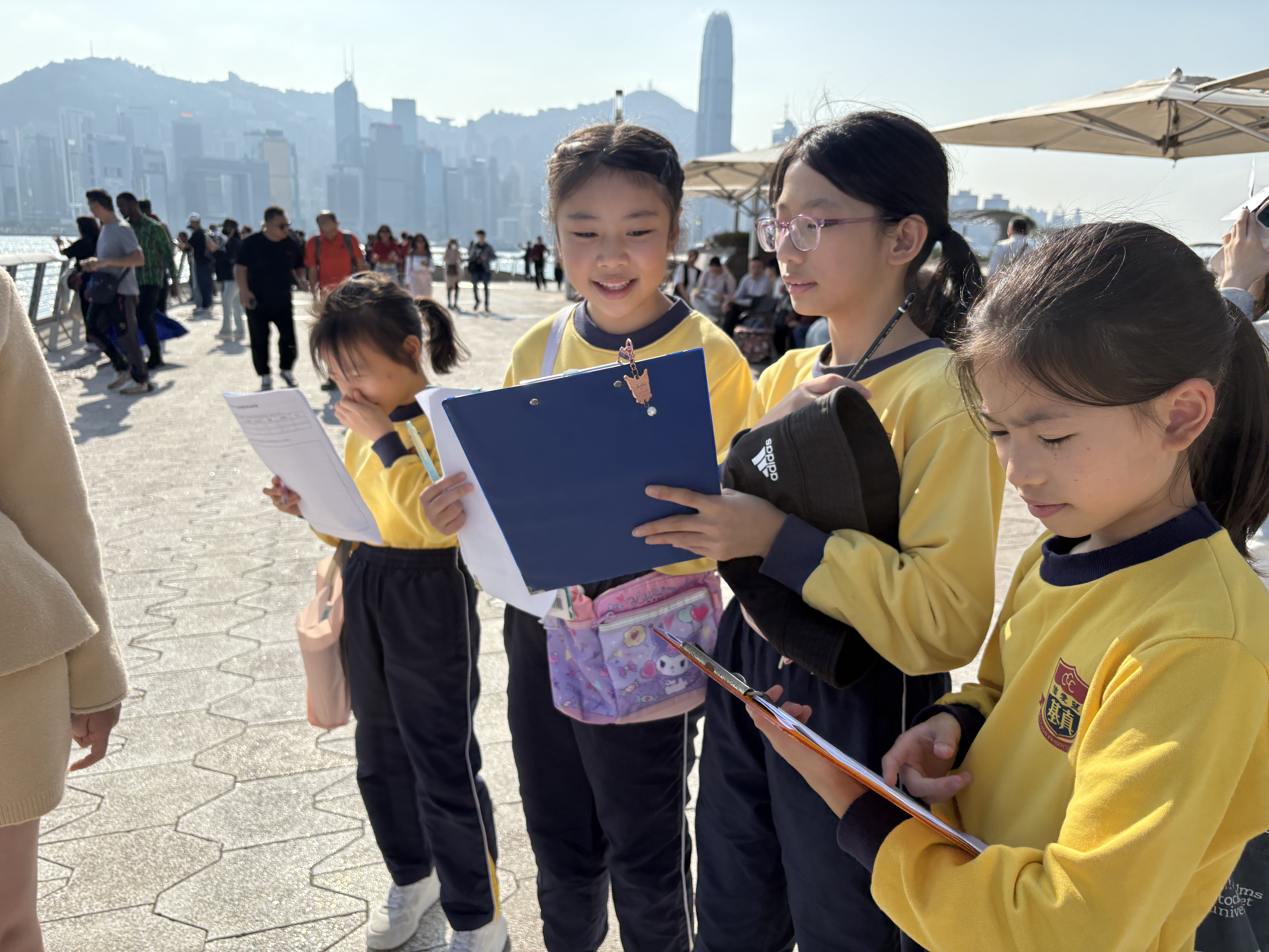 | 五年級學生參觀位於油尖旺區的尖沙咀海旁 | (數學科) 匯報中各組能夠以複合棒形圖展示訪問結果 |