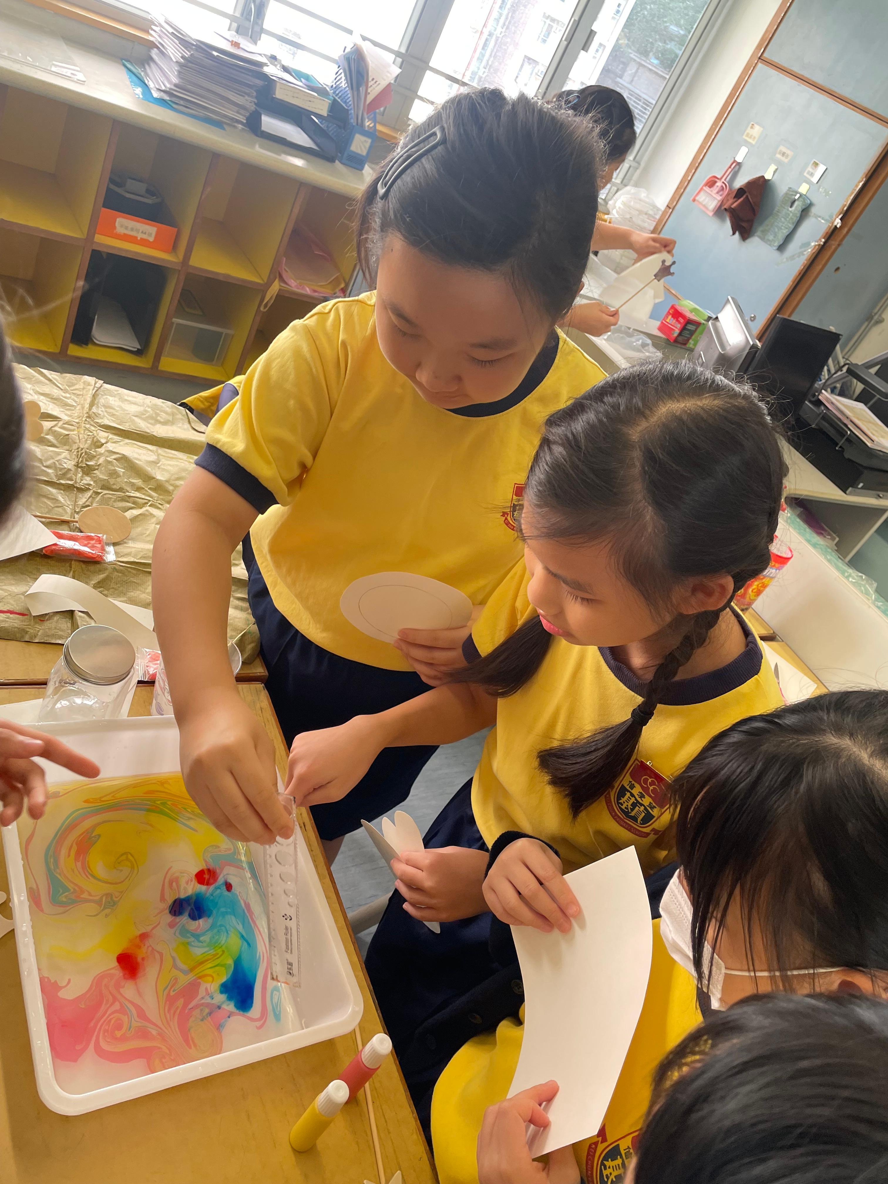 | 同學在藝術創作班中製作玩具 | 同學在體藝課中製作雲石畫 |