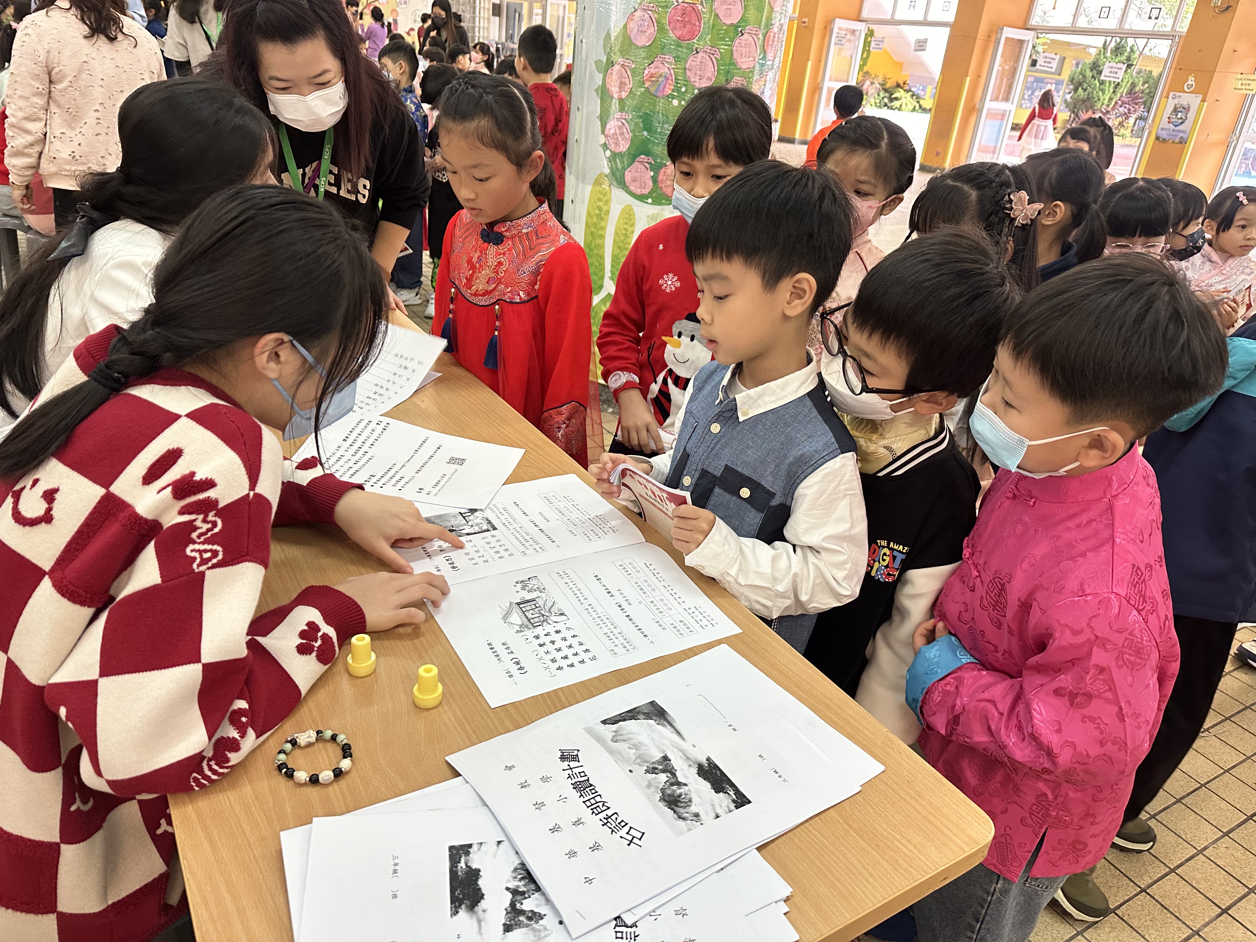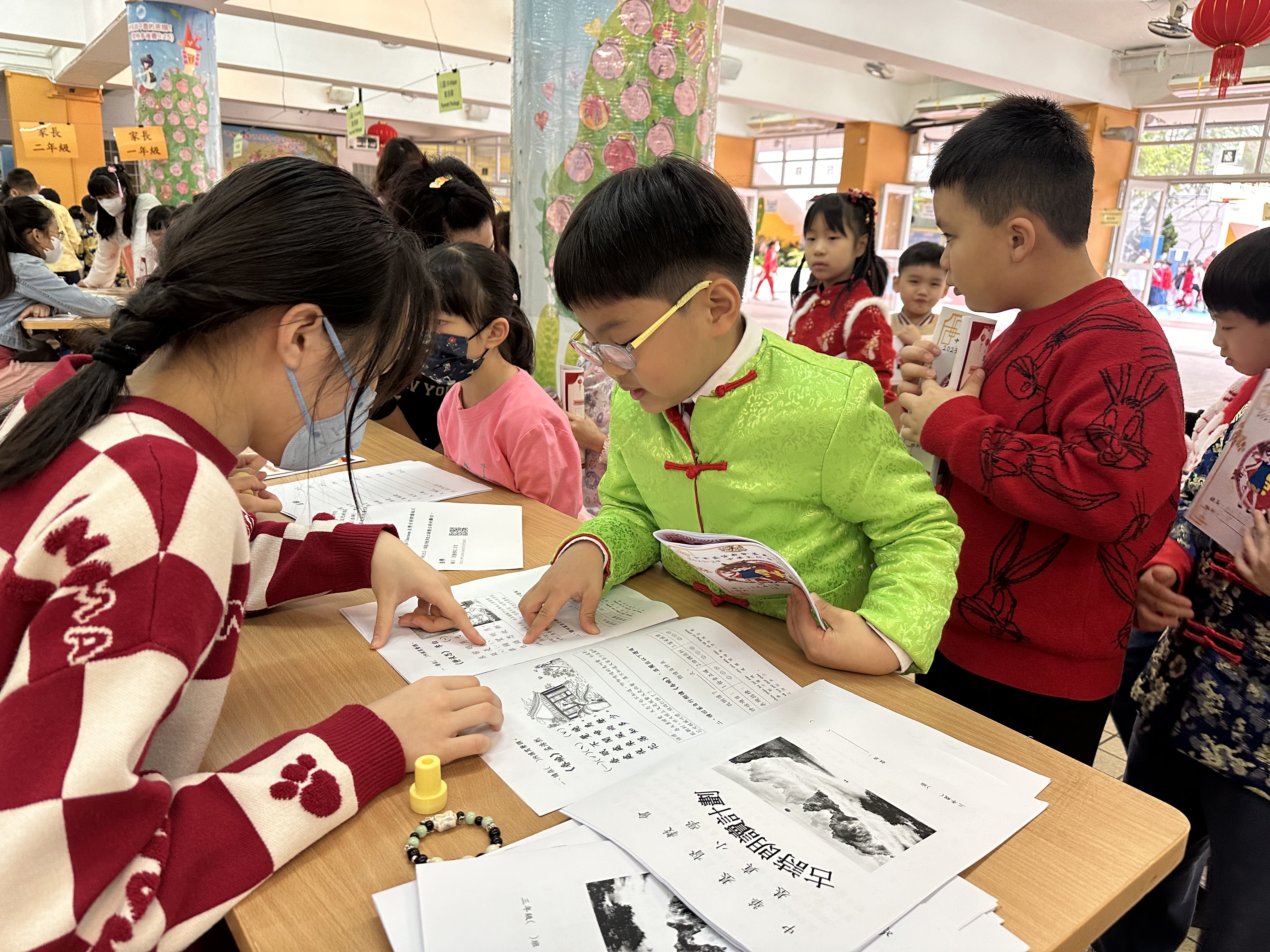 | 一至六年級的學生在中華文化日中積極參與到古詩誦讀攤位遊戲活動 | 一至六年級的學生積極參與到中華文化日的古詩誦讀中 |