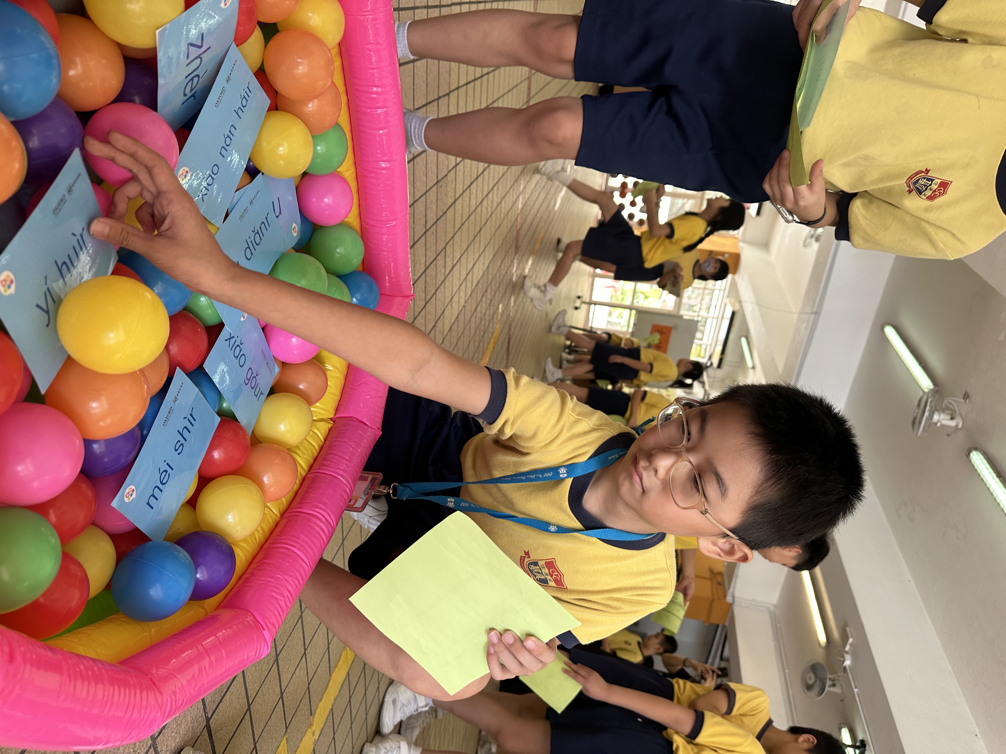 | 三年級的學生在為劇中人物打氣 | 三年級的學生正在參與普通話攤位遊戲活動 |